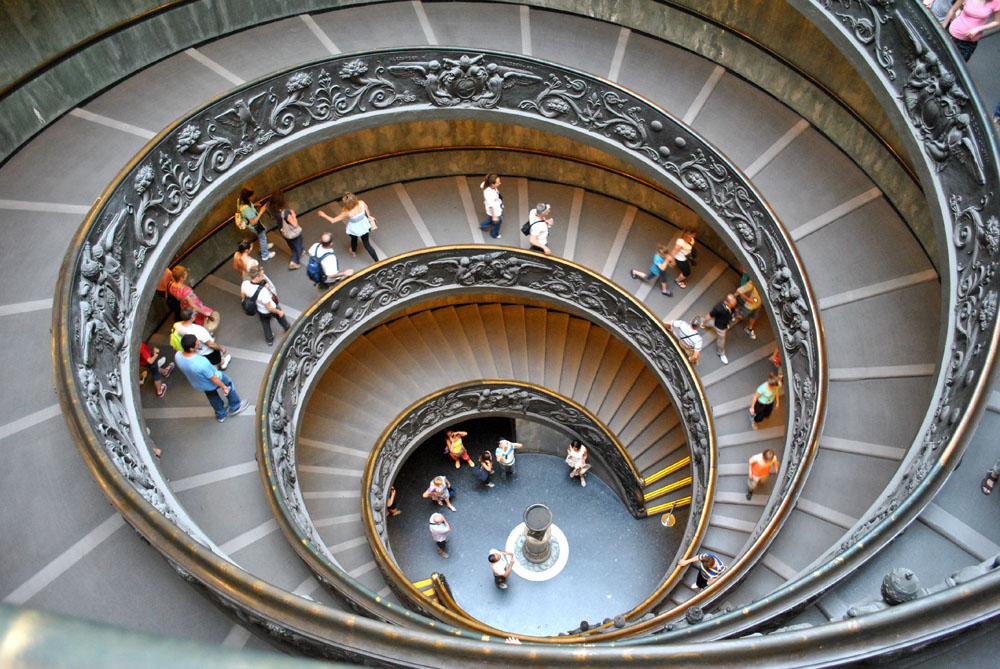 1. Spiral stairs inside the Vatican Museum, designed by a famous Italian architect and engineer, Giuseppe Momo, in 1932. The staircase is shaped like a double helix: it contains two intertwined spirals, one of which leads down, while the other goes upwards.
